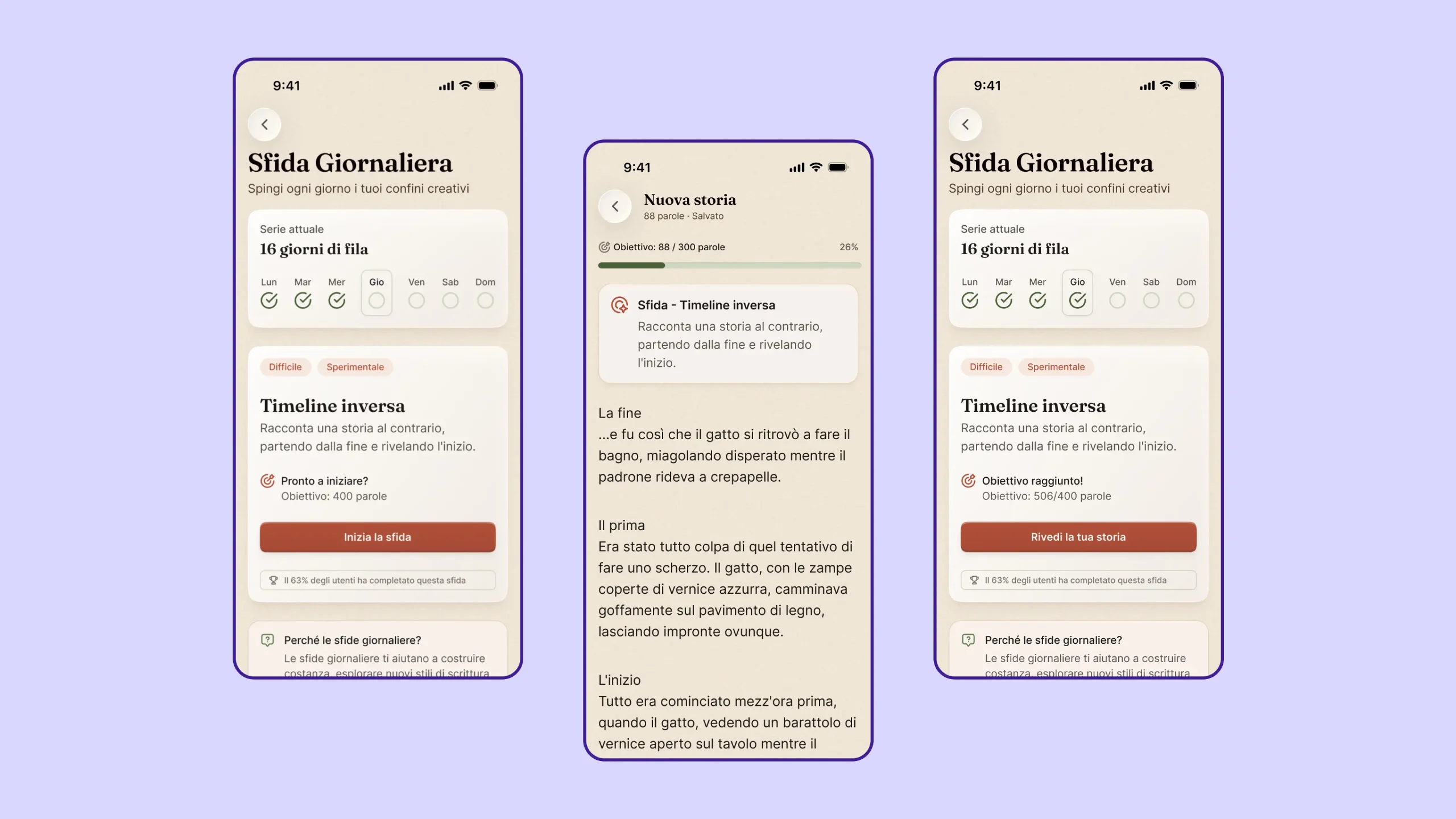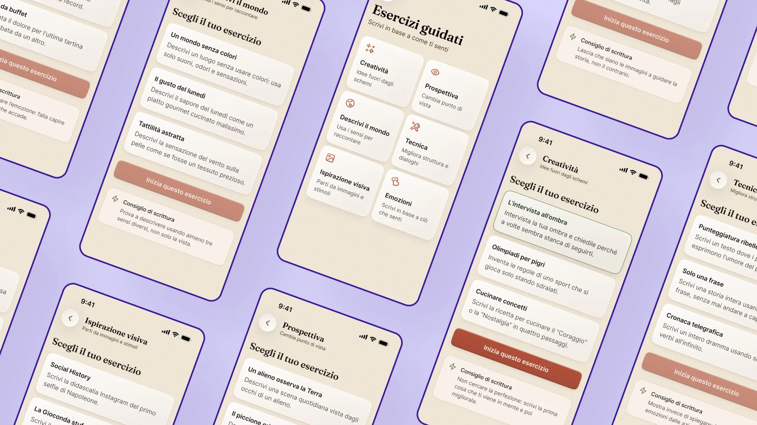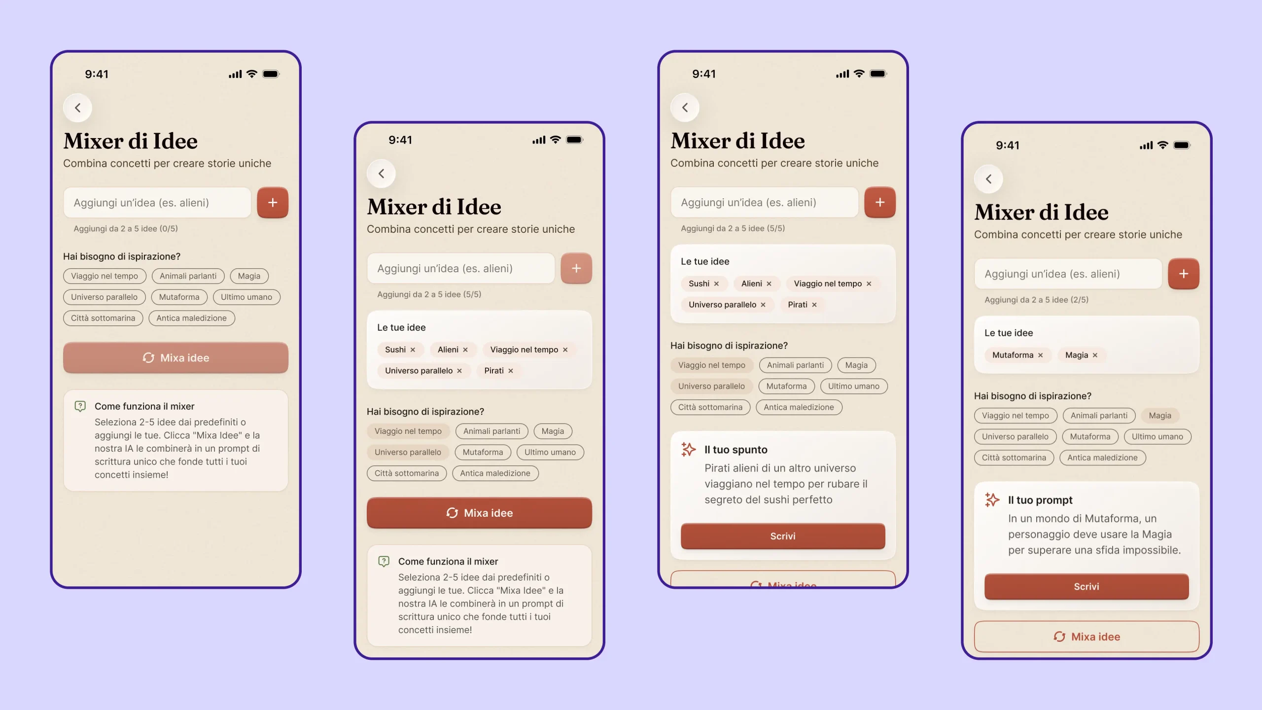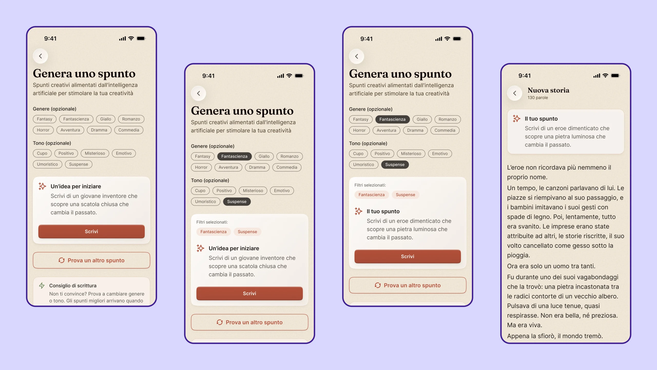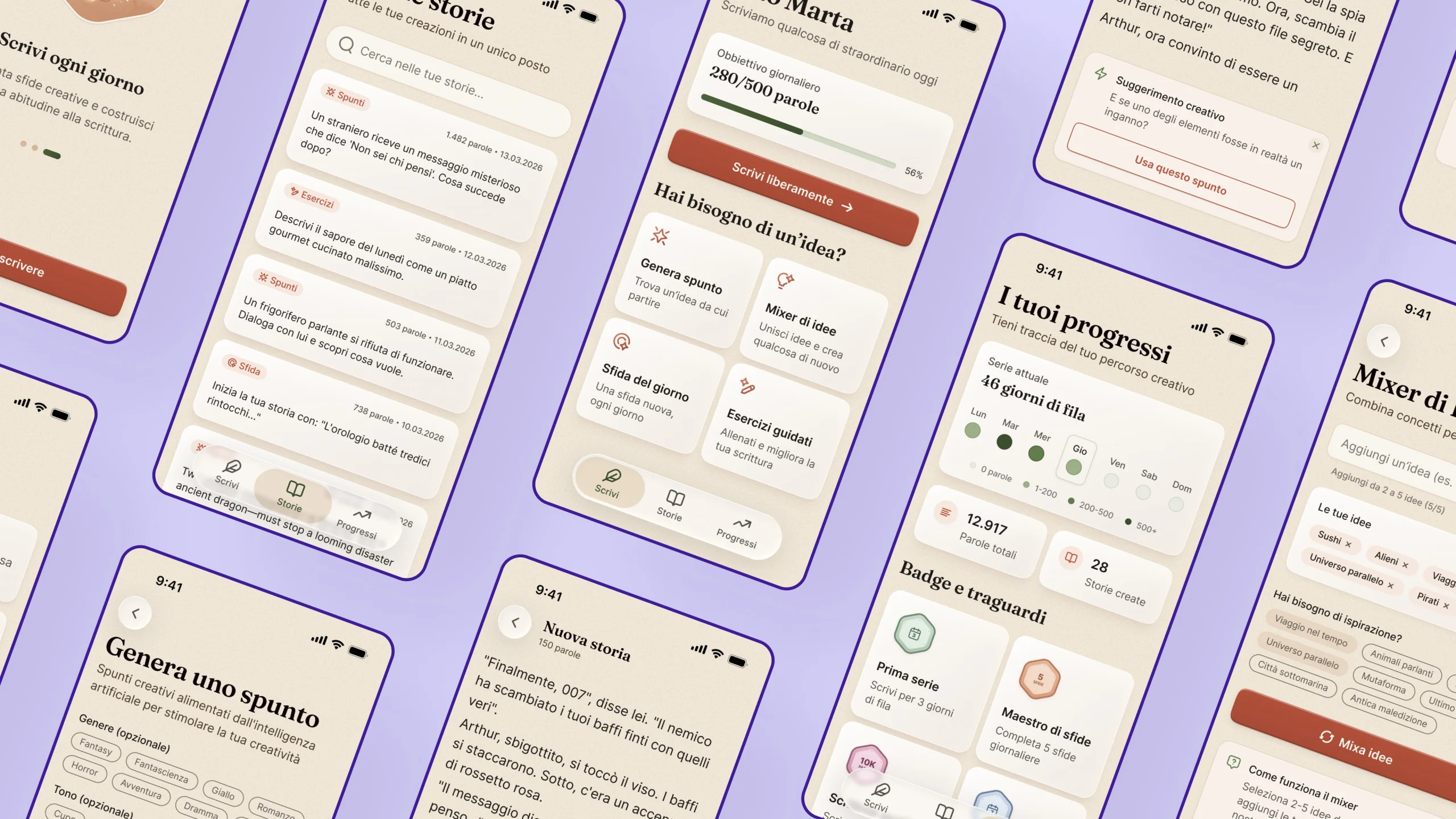 L’esperienza è stata costruita attorno all’editor, che diventa il punto di convergenza di tutti i flussi. Il generatore di spunti evolve da semplice elenco a sistema interattivo controllato. Il mixer di idee introduce una dimensione combinatoria, trasformando l’utente in parte attiva del processo creativo. Gli esercizi guidati mantengono la struttura già presente in Adhara, ma la rendono più flessibile. La sfida giornaliera introduce continuità senza pressione, adattandosi a un approccio più umano.