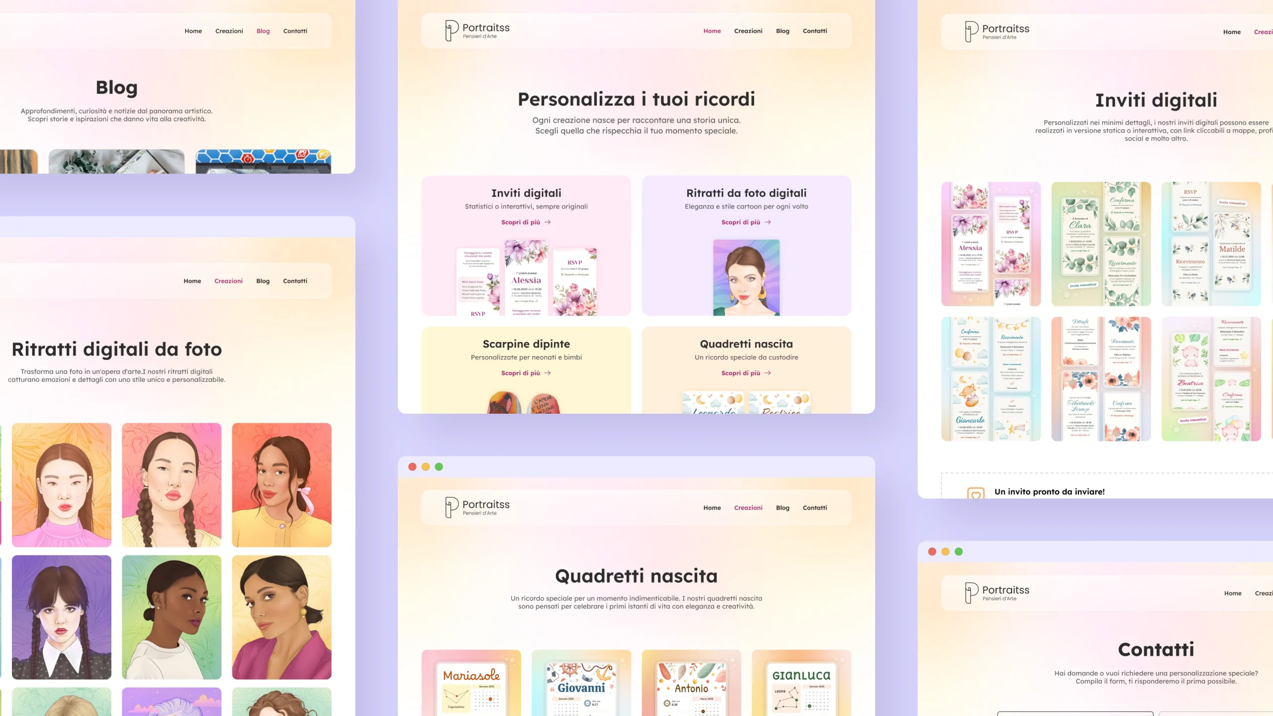 Portraitss - Pensieri d'Arte è un sito vetrina dedicato a creazioni artistiche personalizzate, tra cui scarpe dipinte a mano, quadretti nascita e inviti digitali. L’obiettivo del progetto era riprogettare la struttura del sito per migliorarne la navigabilità e l’usabilità, offrendo un’esperienza più intuitiva e moderna agli utenti.